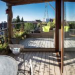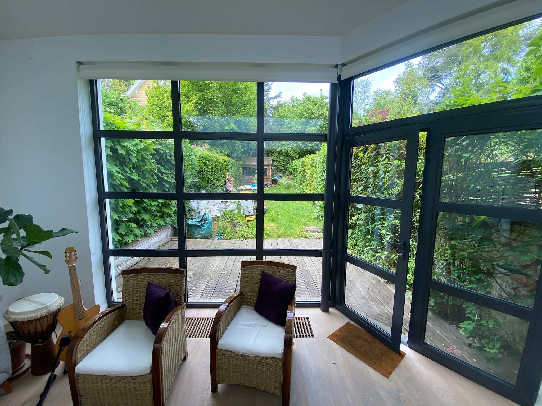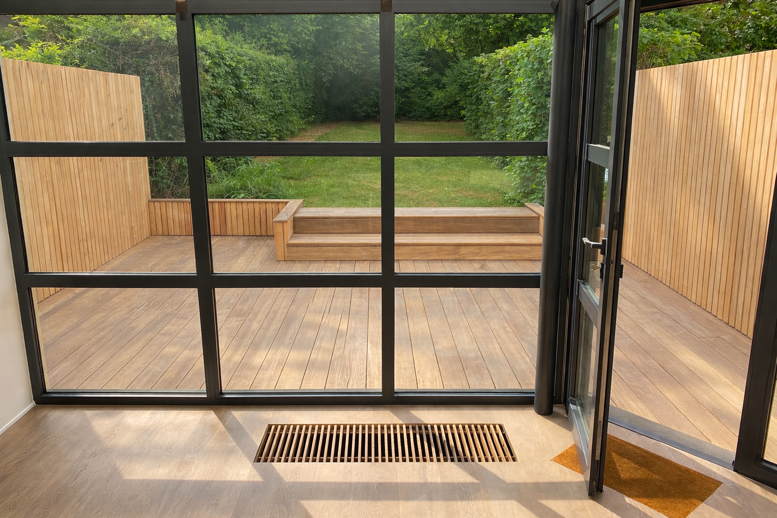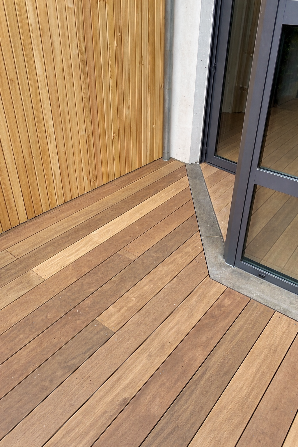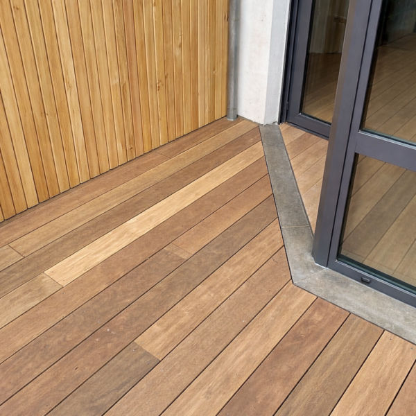 Brise-vues réalisés en mélèze belge, terrasse en IPE certifié FSC.