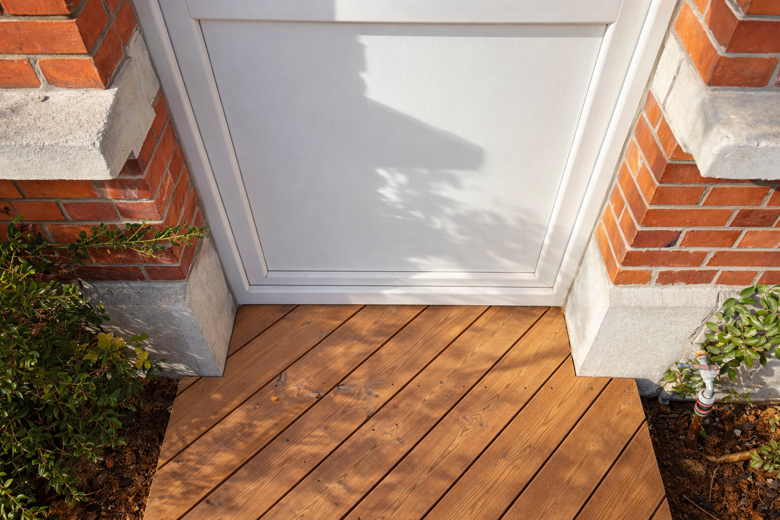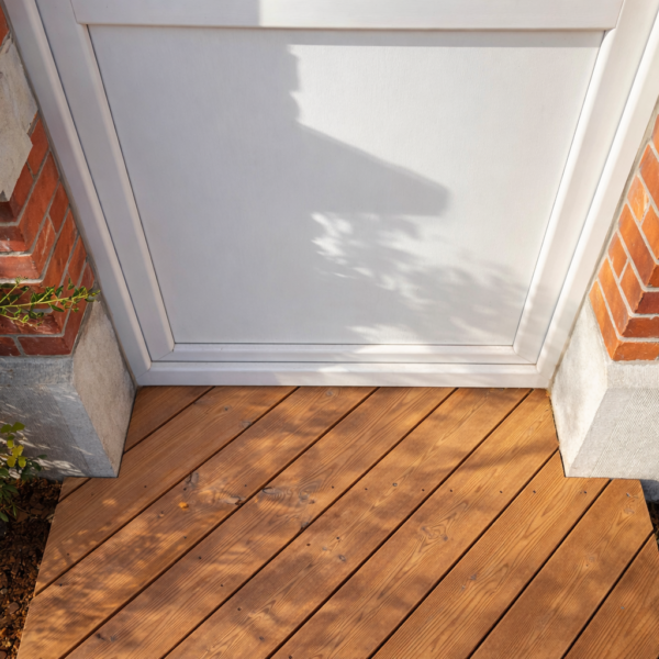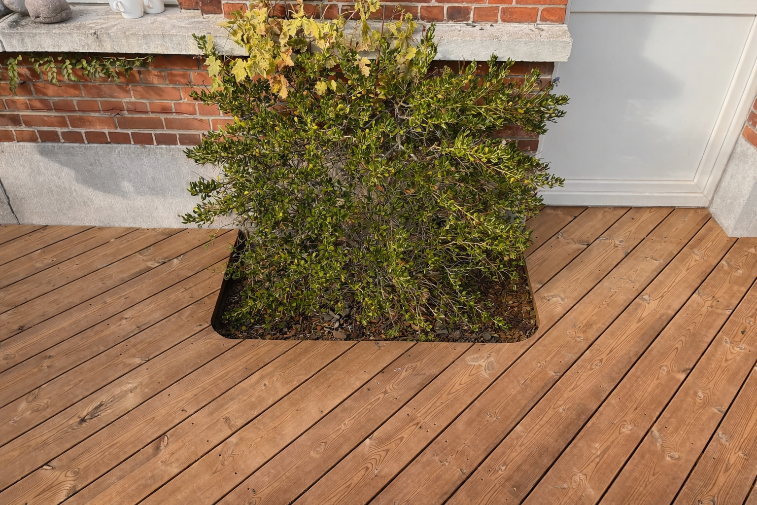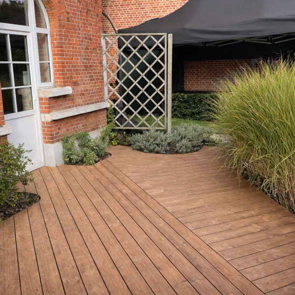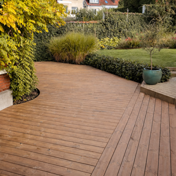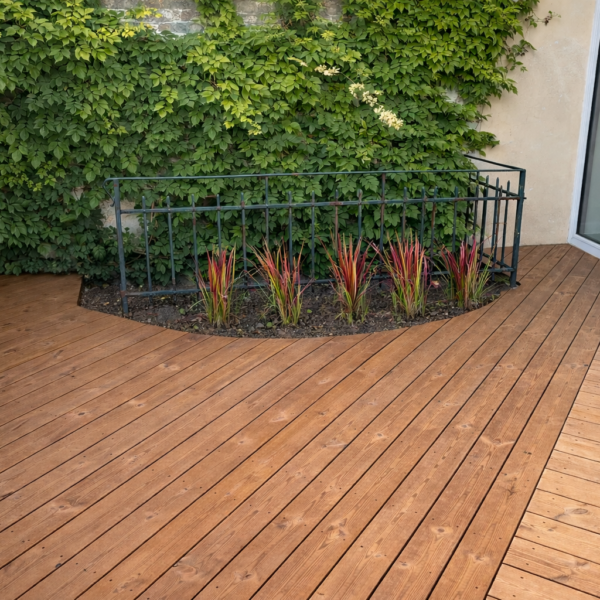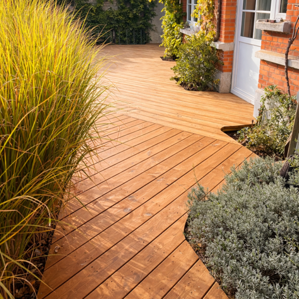 La terrasse s’efface partiellement au profit de la végétation, pour un extérieur vivant et naturel.